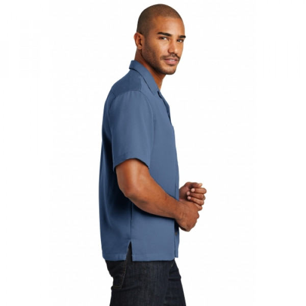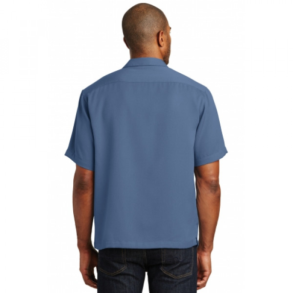 This classic camp shirt is perfect for upscale service environments. Made from no-fuss fabric this shirt has faux- coconut shell buttons and it's designed to keep its great looks wear after wear. ::75/25 poly/rayon ::Open collar ::Patch pocket ::Side vents ::Open hem