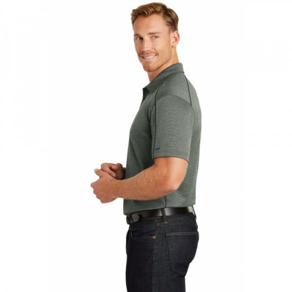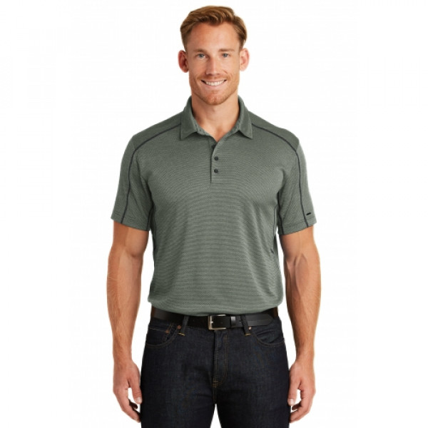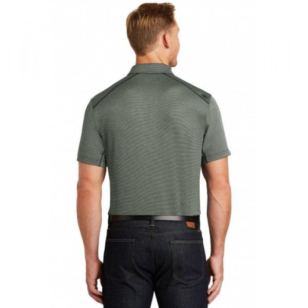 Enter a new orbit of style in this textured, heathered polo.::4.4-ounce, 100% polyester heather double knit jacquard with stay-cool wicking technology::OGIO heat transfer label for tag-free comfort::Self-fabric collar with collar stand::Set-in, open hem sleeves::Metal OGIO bar on left sleeve::Coverstitching throughout::4-button placket with debossed O buttons::Rubber O heat transfer on back right shoulder