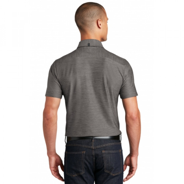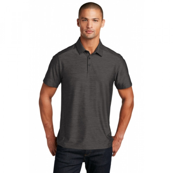 This sophisticated tonal heather polo has a slight slub texture and performs with moisture wicking and stretch for a polished look.::5.2-ounce, 90/10 poly/spandex with stay-cool wicking technology::OGIO heat transfer label for tag-free comfort::Self-fabric collar with collar stand::OGIO woven tab at center back collar::Angled 3-button placket with flat matte black silicone buttons::Forward side seams::Set-in, open hem sleeves::Black reflective O on left sleeve
