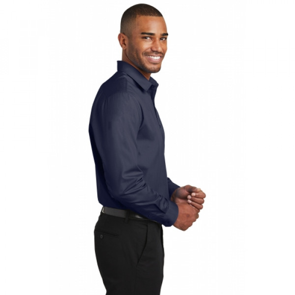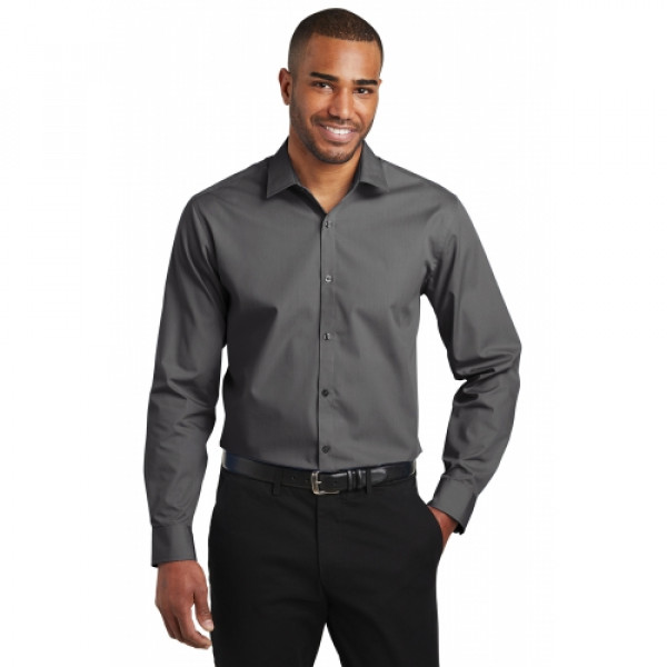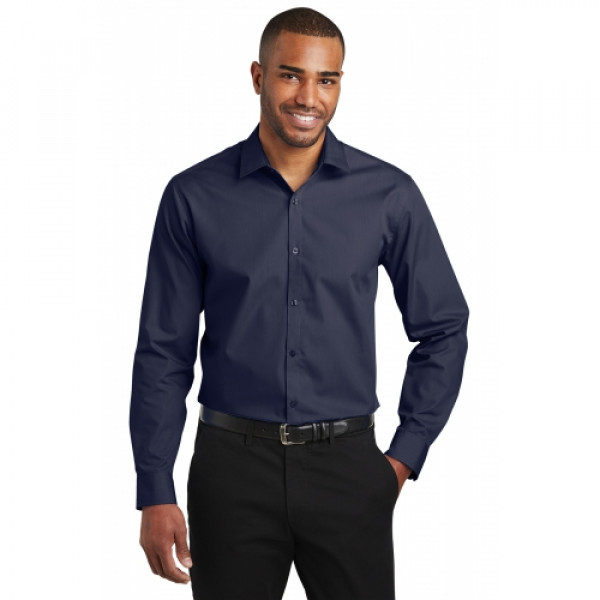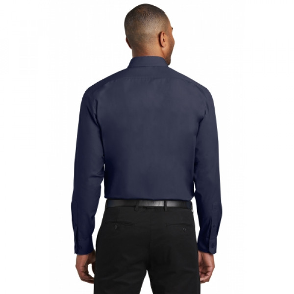 Lightweight and breathable, the Port Authority Men's Slim Fit Carefree Poplin Shirt keeps its professional edge thanks to a stain-release finish, which releases stains during washing. Budget-friendly and durable, these virtually carefree shirts feature an Easy Care blend and finish. They also color-coordinate with our Core Classic Pique Polos for seamless uniforming. Made from 3.3-ounce fabric blend of 55% cotton and 45% polyester. Designed for individuals who like a slim fit, but not overly tight, with a silhouette that sits comfortably close to the body. Features an open collar, dyed-to-match buttons, and rounded adjustable cuffs.