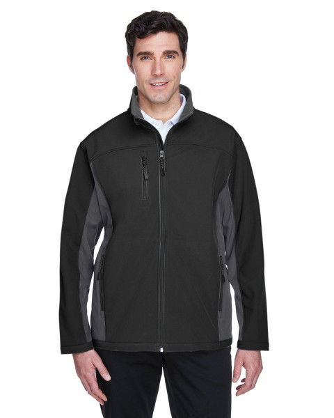 The Devon and Jones Men's Soft Shell Colorblock Jacket is the perfect outerwear staple for your team! ::96% polyester, 4% spandex bonded to 100% polyester microfleece::1000 mm waterproof rating::Wind- and water-resistant::Interior storm flap with chin guard::Open hem with dropped back bottom::Open hem cuffs::Set-in sleeves; Zipper front pocket; Vertical zipper pocket on right chest