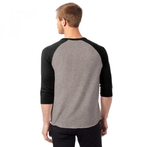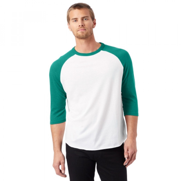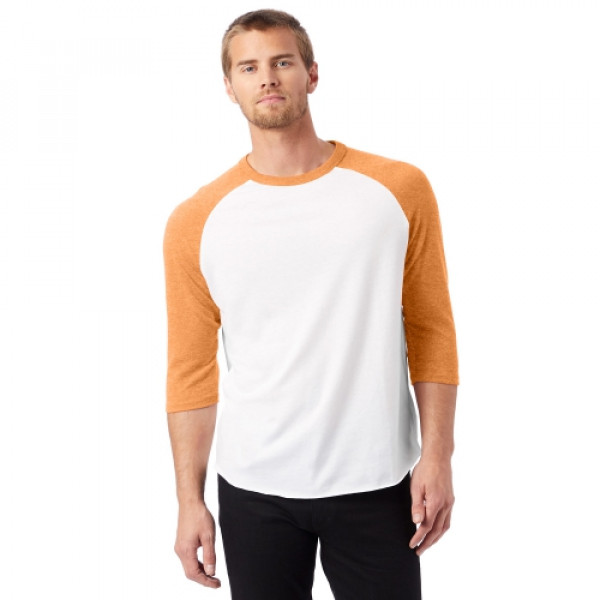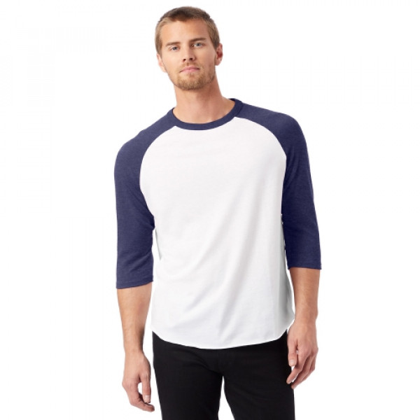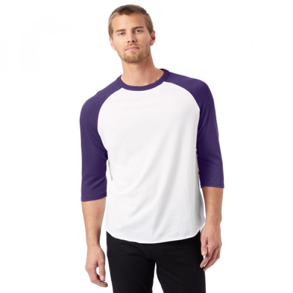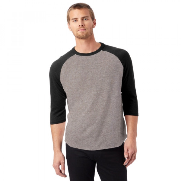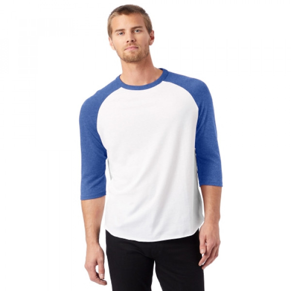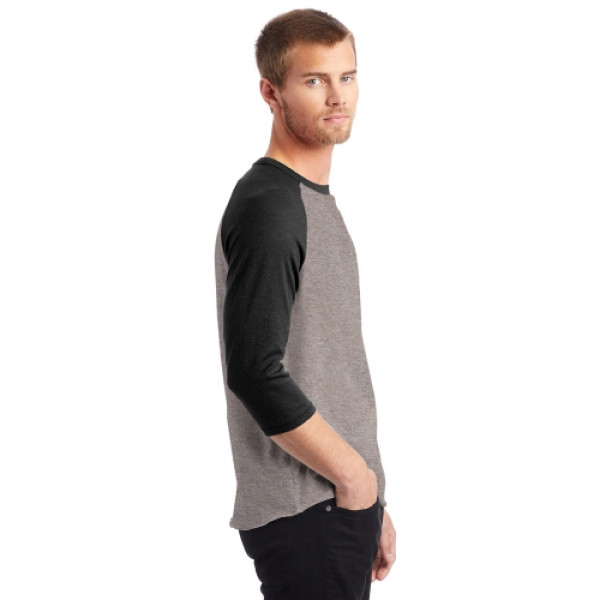 Fabric:::4.4 oz., 50% cotton, 50% polyester, 20 singlesFeatures:::Classic fit::Coverstich at sleeve and bottom hem::Contrast raglan three-quarter sleeves::Slight shirttail hem::Tear-away label::Imported