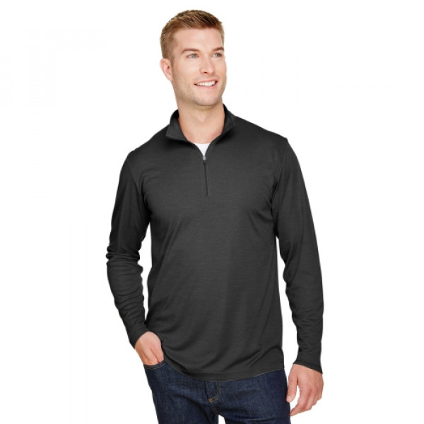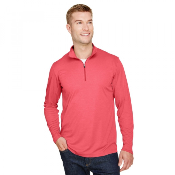 The Team 365 Men's Zone Sonic Heather Performance Quarter-Zip is made of lightweight 3.8 oz./yd² / 130 gsm, 100% polyester, sonic heather interlock fabric. It effectively wicks away moisture and provides UV protection. The front features a coil zipper with a semi-autolock slider and rubber pull for easy use. It's designed for a team fit, ensuring comfort for active wear. The label is heat-sealed for added convenience. Additionally, cationic dyes are used to ensure vibrant colors that resist fading.