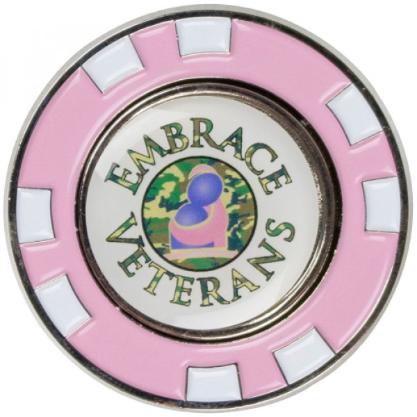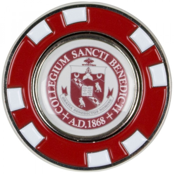 ::Solid metal poker chip with two-sided imprint and removable magnetic ball marker::Back side features fixed domed label for added exposure or co-op partnering