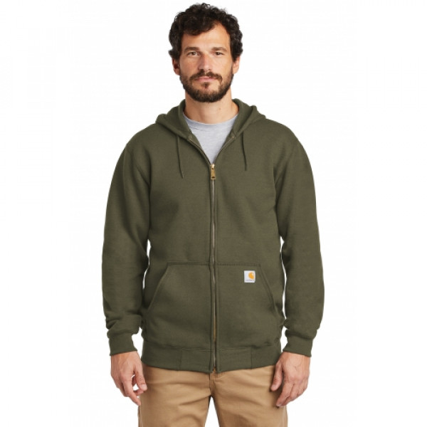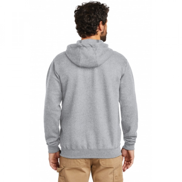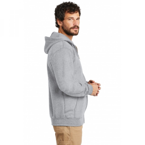 ::10.5-ounce, 50/50 cotton/poly blend::70/30 cotton/poly blend (Heather Grey)::Attached three-piece hood with drawcord closure::Full-length brass front zipper::Two front hand warmer pockets::Stretchable, spandex-reinforced, rib knit cuffs and waistband::Carhartt-strong, triple-stitching on pocket::Carhartt label sewn on left hand warmer pocket::Original fit