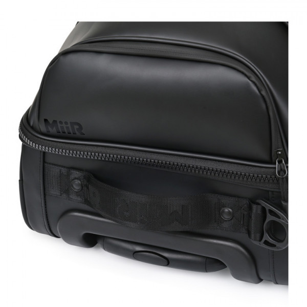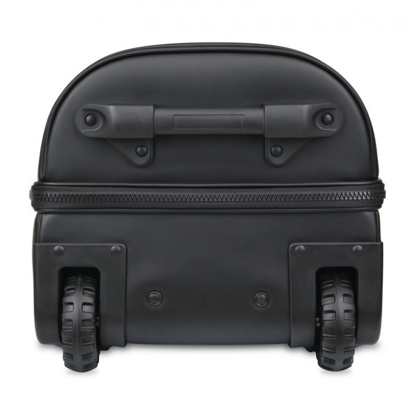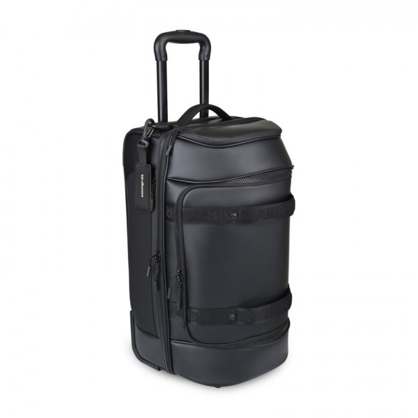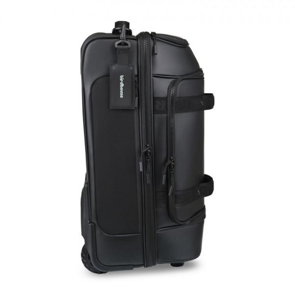 - Dual zippered opening reveals two separate compartments; drop bottom contains two packing cubes