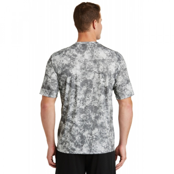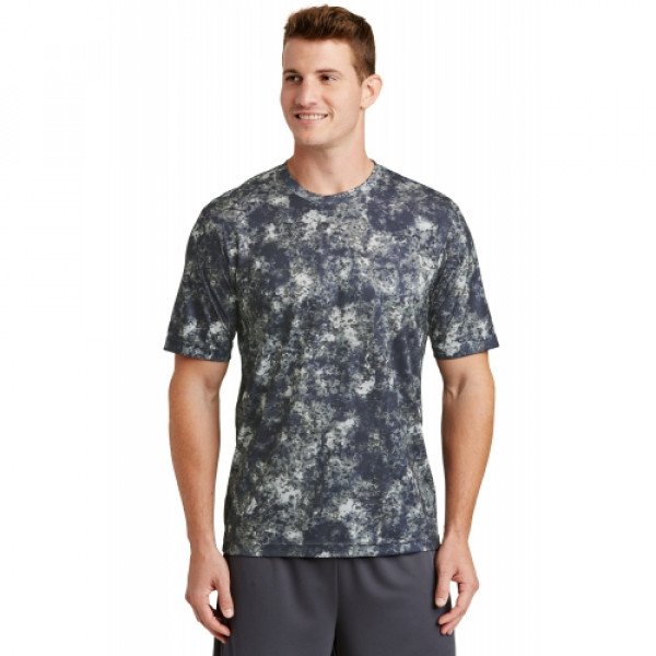 This moisture-wicking tee features an allover sublimated print that has a granite-like look.::3.8-ounce, 100% polyester interlock::Tag-free label::Set-in sleeves::Choose from 6 colors