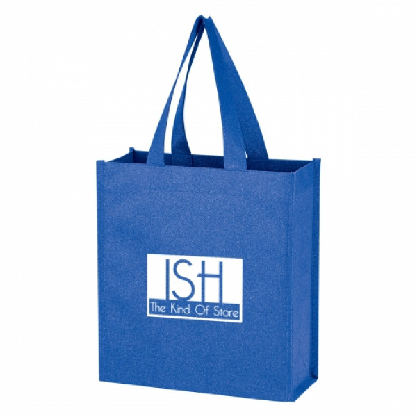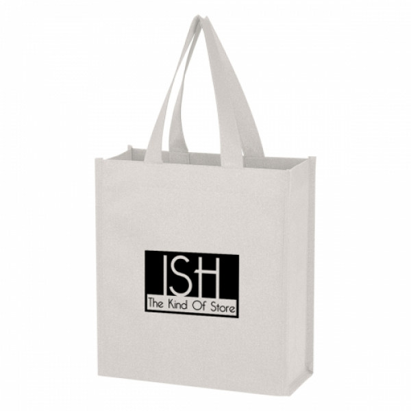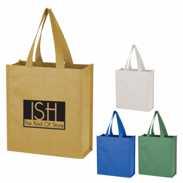 ::Made Of 80 Gram Laminated Non-Woven, Coated Water-Resistant Polypropylene::Glitter Pattern Material Will Not Flake::3 ½" Gusset::13" Handles::Spot Clean/Air Dry