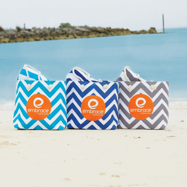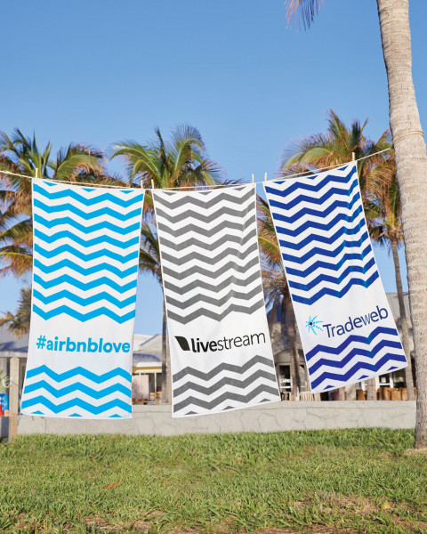Make all kinds of waves at the beach. With its bold chevron pattern, the Monte Carlo Beach Towel literally points the way to your logo. Smartly coordinating with our Monte Carlo Tote, the jacquard woven construction results in extra thick, absorbent terry cloth. When it comes to style, comfort and durability, the Monte Carlo hits the jackpot. 30” x 60”, 15 lbs./doz.