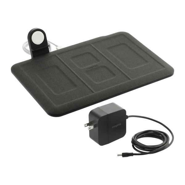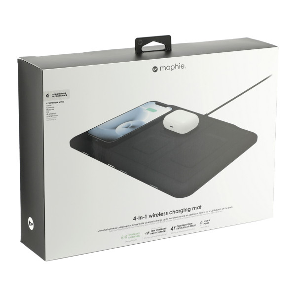 The mophie® 4-in-1 Wireless Charging Mat is designed with dedicated wireless charging spots for smartphones, Apple Watches, and Airpods/Airpod Pros.