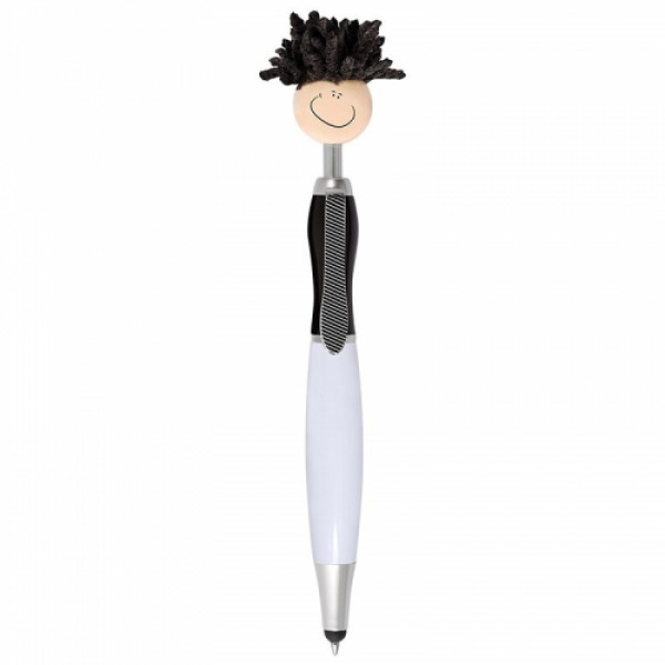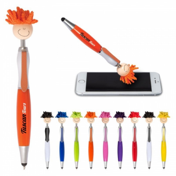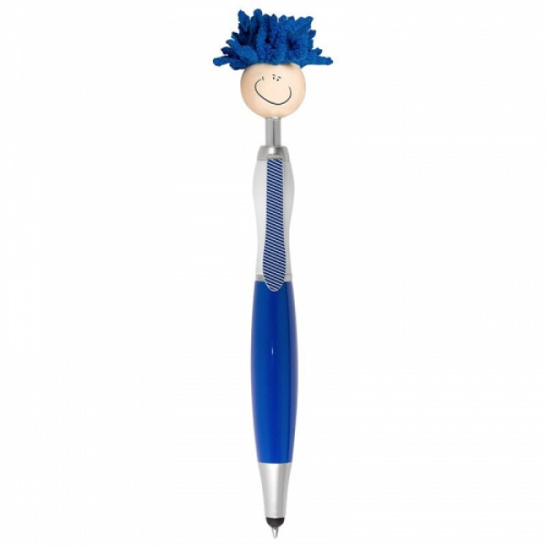 The Mop Topper Stylus Pen is made from sturdy ABS plastic with a microfiber screen cleaner at the end. This click-action ballpoint pen features a smiley face, tie-shaped clip and mop-top hair! ::Soft silicone tip for use with touchscreen devices ::Long-lasting chenille microfiber hair functions as a screen cleaner ::MopTopper™ is patented ::Choose from 5 colors