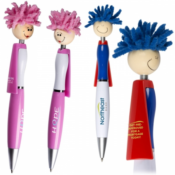 ::ABS plastic click-action ballpoint pen with smiley face, superhero cap and mop-top hair ::Long-lasting chenille microfiber hair functions as a screen cleaner ::Choose from 2 colors::Black ink, medium point::Free 24 hour production with orders up to 1200 pieces, 1 color only