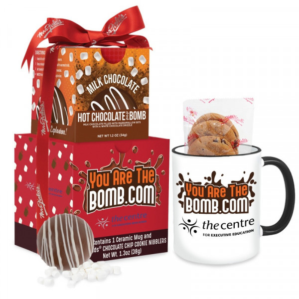 What’s better than a warm cup of hot chocolate? A delicious hot chocolate bomb paired with Mrs. Fields® cookies and a custom full-color ceramic mug! This irresistible gift set includes a premium 11 oz. ceramic mug, a three-pack of Mrs. Fields® Chocolate Chip Cookie Nibblers, and a decadent hot chocolate bomb—all beautifully packaged in a fully customizable gift box with a hand-tied ribbon. Perfect for holiday gifts, corporate giveaways, or special occasions, this set is a treat that everyone will love!