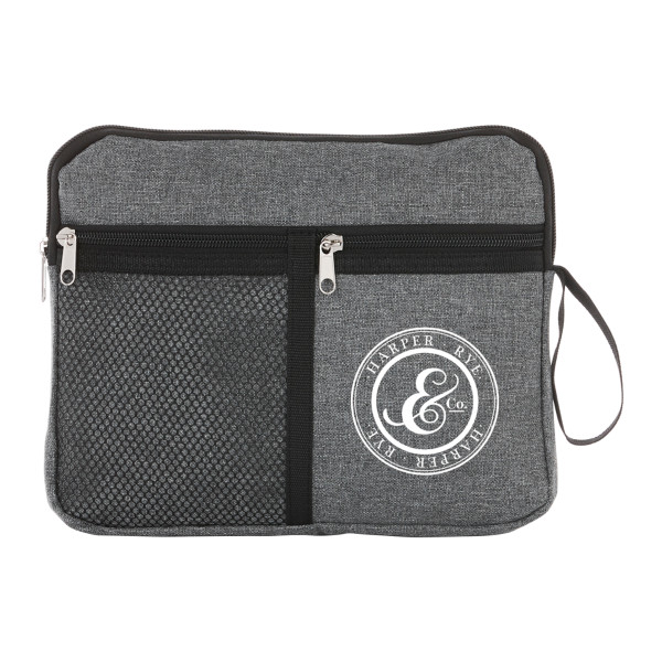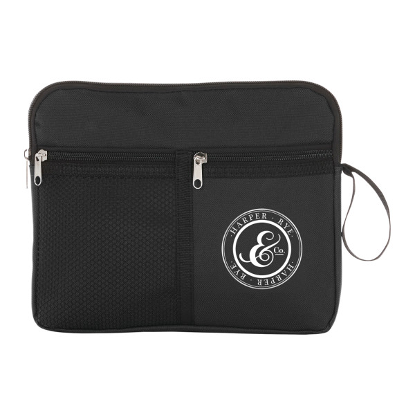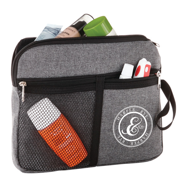 The Multi-Purpose Travel Bag is ideal for toiletries, cosmetics or other travel necessities. ::It features a zippered top pocket, front mesh pocket and a side loop.