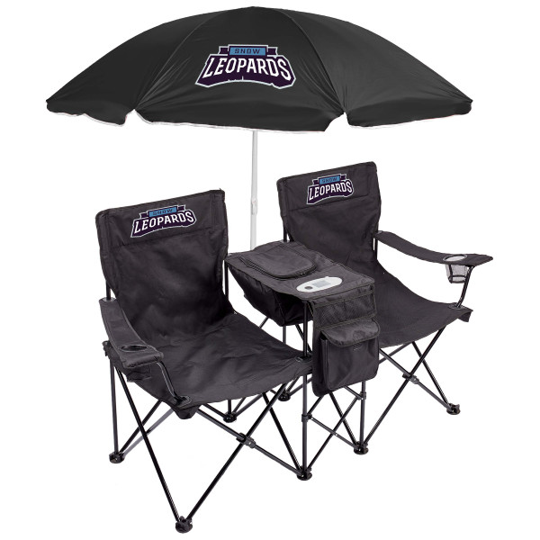 - Includes two chairs with connected beach umbrella and 12-can soft cooler with front pocket