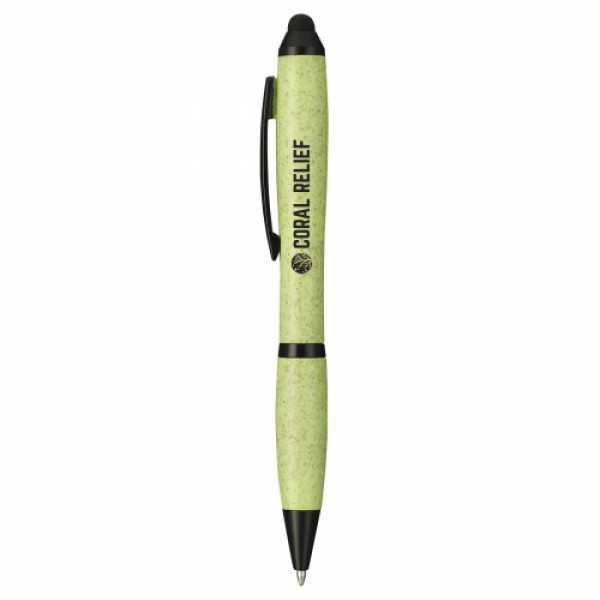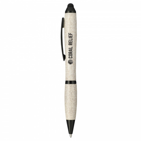 The Nash Wheat Straw Ballpoint Stylus Pen features a 40% wheat straw barrel with black accents. ::Soft rubberized touch stylus. Twist action mechanism. ::Black ink cartridge with 1.0mm pen tip. ::800m writing length. ::Through a partnership with 1% For The Planet one percent of sales of this and all EcoSmart products will be donated to nonprofits dedicated to protecting the planet.