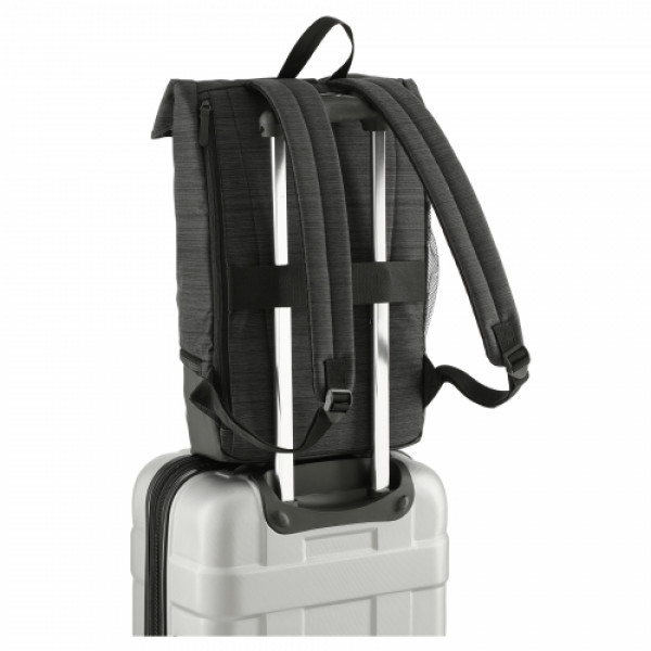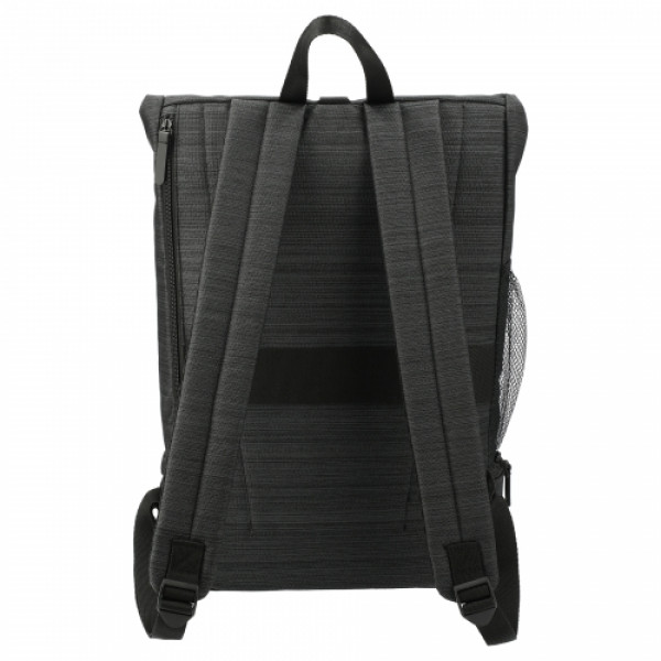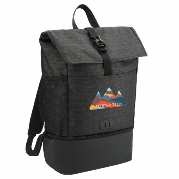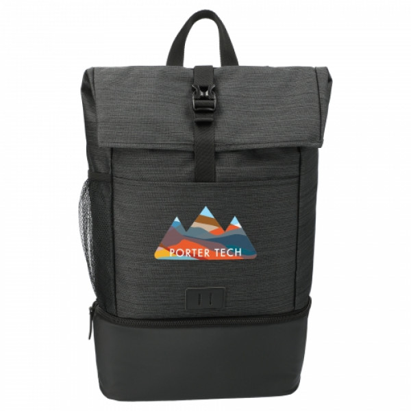 ::NBN stands for "No Brand Needed." The NBN Whitby Insulated 15" Computer Backpack gives you the best of both words - a top section that includes a dedicated padded 15" laptop compartment, as well as a zippered PEVA lined bottom cooler compartment. ::Perfect for heading back to school or the office, all your daily essentials can fit in the roll top compartment, while your bento box and drink for lunch can stay cool in the bottom. ::The front slash pocket is perfect for keeping your mask or keys nearby. ::This backpack features cutstom lining, a premium vinyl lash-tab, and adjustable padded shoulder straps. ::This bag includes an oversized zipper pull that's available to decoration.