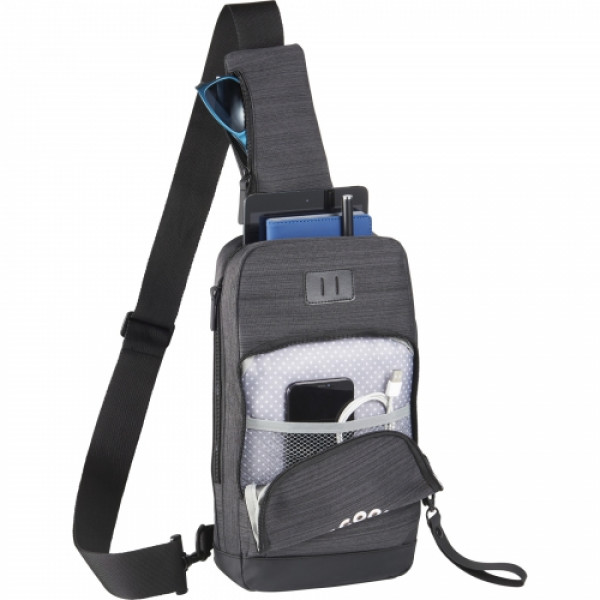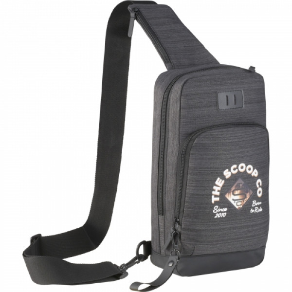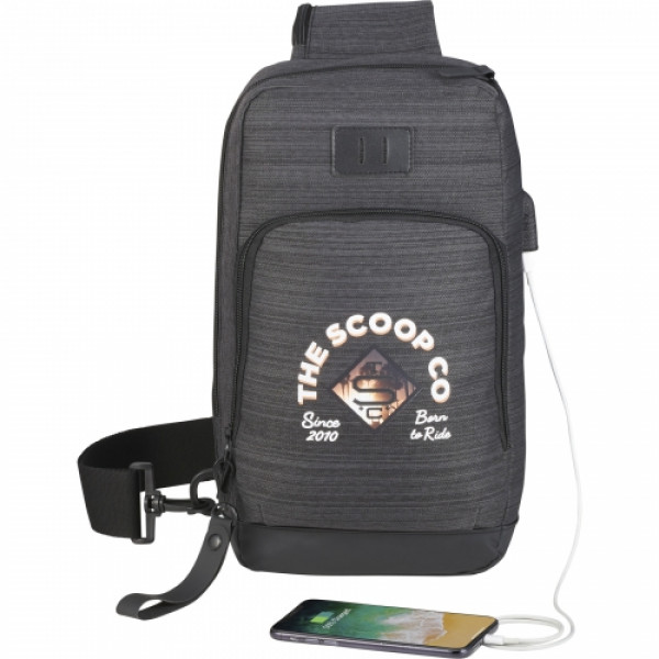 NBN stands for "No Brand Needed." The NBN Whitby Sling w/ USB Port makes the perfect daypack or travel companion. ::This sling includes a side USB port with cable for easy charging on the go and an adjustable shoulder strap with a zippered pocket big enough for your phone. ::Get extra features like a front zippered pocket, internal organization, premium vinyl lash tab and custom printed lining with this sling. ::Looking for a new way to showcase your brand? This bag includes an oversized zipper pull available for decoration.