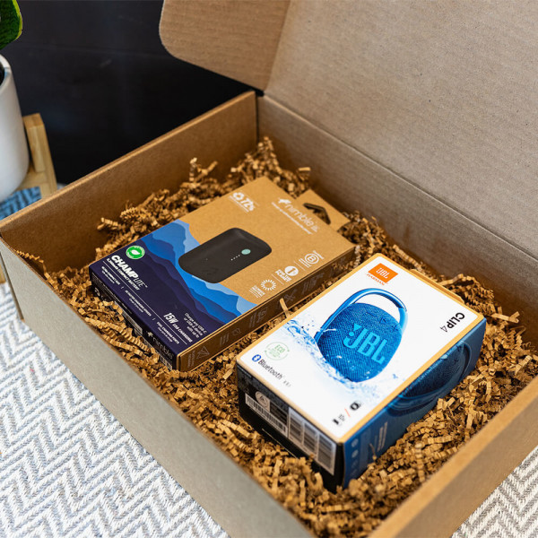 This custom set is perfect for holiday gifting, and includes a Nimble Champ Lite Portable Charge 5K - 5,200mAh and a JBL Clip 4 Eco Ultra-Portable Waterproof Speaker. Make your friends and family smile with this branded bundle! Include a custom greeting card for another level of appreciation.