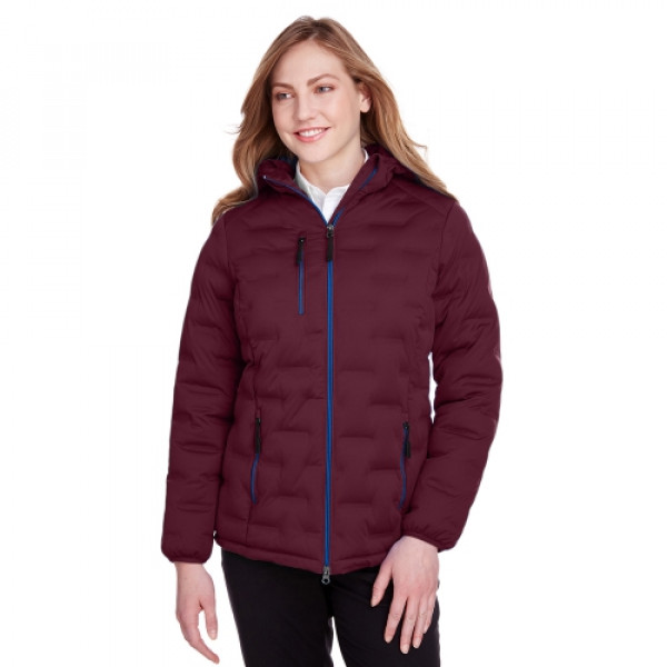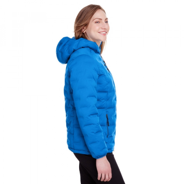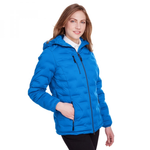 ::4 oz.yd/2 / 135 gsm, 3-Layer 100% polyester stretch jersey with 6,000 mm bonded waterproof membrane::Polyester taffeta lining::20g polyester UTK SubDown™ fill::Laminated stretch shell with welded puffer channelling::Center front coil zipper with contrast teeth, autolock slider and rubber toggle::Right chest and lower front zippered pocket with contrast teeth and rubber toggle::Dyed-to-match stretch binding::Audio port access through inside left pocket::Princess seams for flattering feminine fit::UTK Hydropel::Water-resistant::Windsmart technology::Active fit::Easy care
