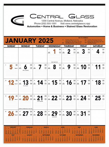 This giant planner is used in most industries. Date blocks contain faintly ruled lines along with symbols denoting the days elapsed and remaining in the year, work days remaining without Sunday & Saturday and work days remaining without Sunday.