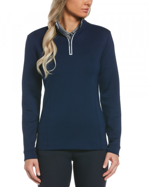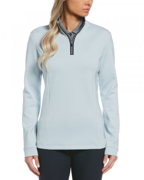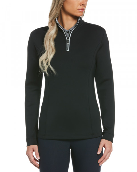 - 1/4-zip design with contrast tipping for a refined look