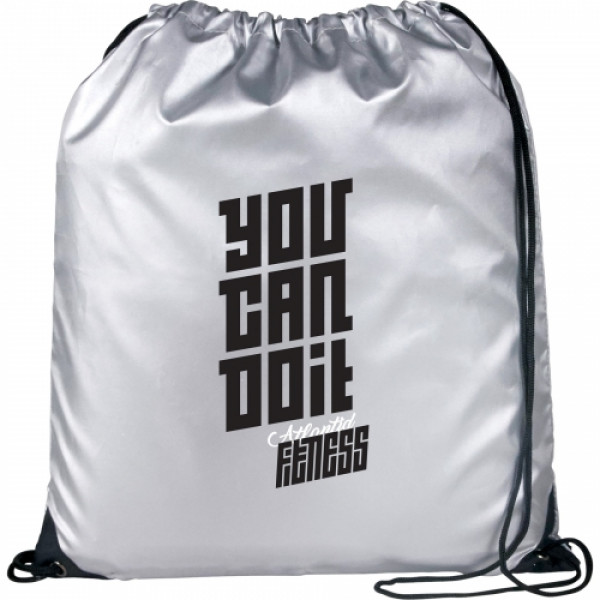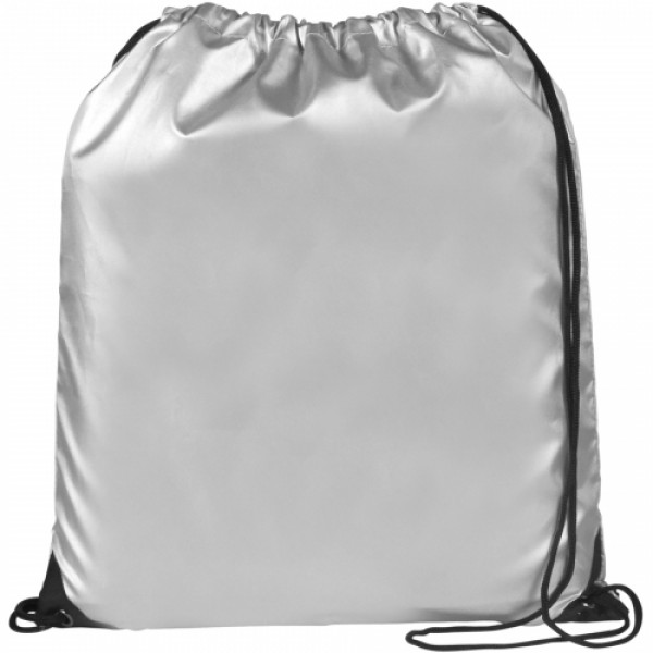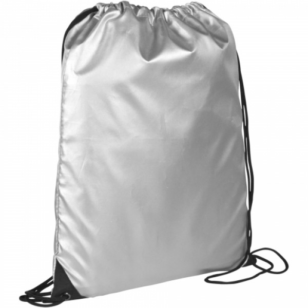 The Oriole Reflective Drawstring Bag includes an open main compartment with a cinching rope closure and reinforced bottom corner tabs. This reflective bag is kid-friendly.