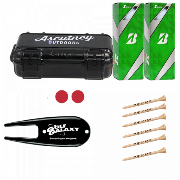 - One Drybox by Otter box, 1 Divot tool; six 3-1/4 tees, 2- Ball markers (undecorated); 2 sleeves of Bridgestone Treo golf balls
