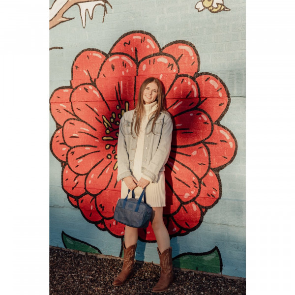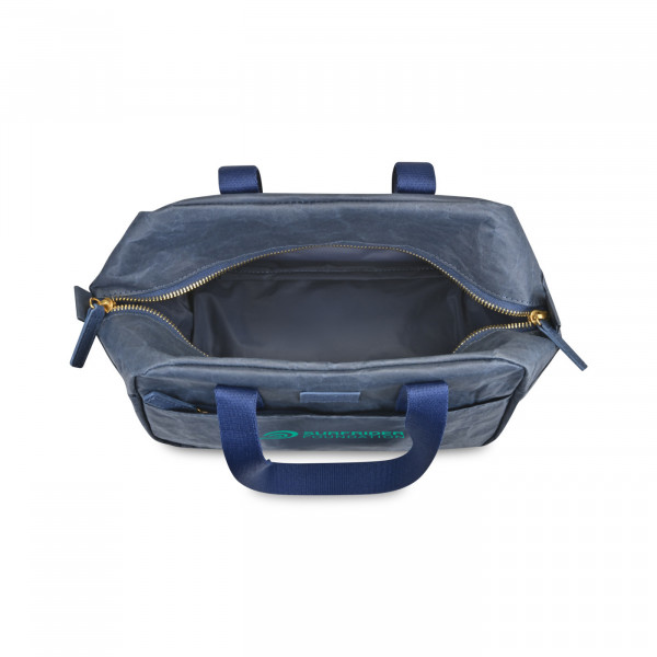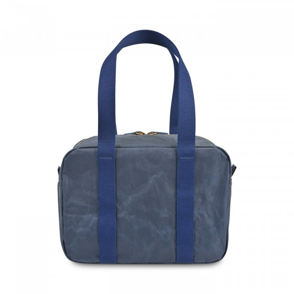 - Modern navy design with gold accent zippers