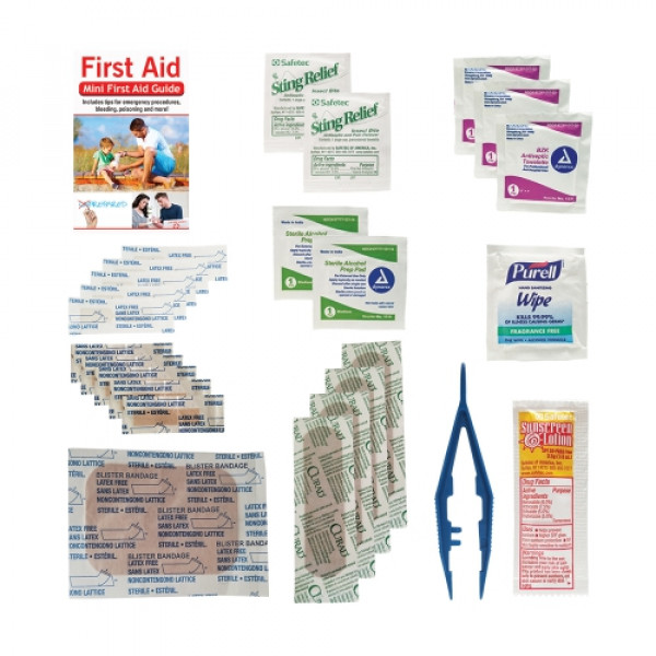 Let's face it, it's almost impossible to avoid those bites, scratches, and cuts when adventuring in the great outdoors. That’s why we created this outdoor safety and first aid kit you won't dare leave home without. For starters, the portable nylon zippered bag is tear-resistant (the rippy kind of tear, not the owwy kind—that’s where the bandages come in). The bag itself is also super customizable, allowing you to pick a color and add your logo to fully represent your brand. Let no blister go unprotected, no boo boo go unattended, and no prospective customer go unconverted when you order these first aid kits.::Contents: 1 Blister Bandage, 1 Sunscreen Packet (3.5g), 1 pair tweezers, 2 sting swabs, 1 first aid guide, 4 bandages (3/4” x 3”), 10 Junior Bandages, 1 Antibacterial Hand Wipe, 2 Alcohol Prep Pads, 3 BZK Antiseptic Swabs