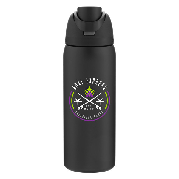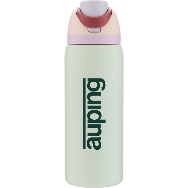 Stay refreshed wherever your day takes you with this 32 oz thermal bottle—an ideal promotional product that can be custom decorated or branded to showcase your logo. Crafted from durable 18/8 stainless steel with double-wall construction and copper vacuum insulation, it keeps cold beverages chilled for hours. The dual-purpose threaded lid features a push-button lock, offering the convenience of sipping through the built-in straw or tilting back to drink from the wide-mouth opening, all finished in a stylish, powder-coated grip.