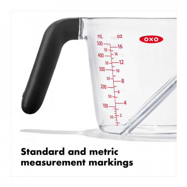 - Markings in both standard (cups/ounces) and metric (milliliters) units