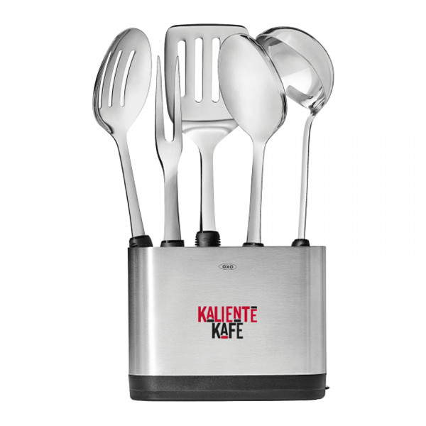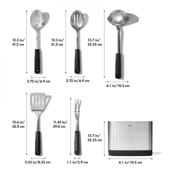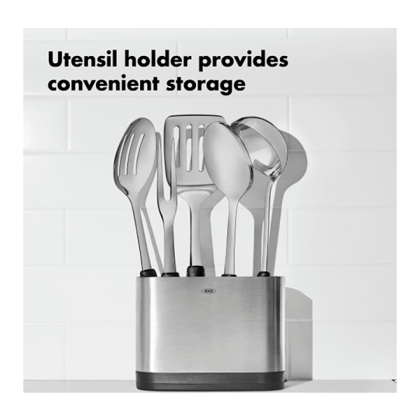 The OXO Good Grips 6-Piece Prep & Serve Set transitions seamlessly from kitchen to table. The elegant stainless steel construction is built to last, and each tool in the six-piece set is designed with comfort in mind. The Utensil Holder provides a neat spot for storing the tools, holding them upright for easy access. Set includes Stainless Steel Turner, Stainless Steel Spoon, Stainless Steel Slotted Spoon, Stainless Steel Ladle, Stainless Steel Fork, Stainless Steel Utensil Holder. Non-decorated components are dishwasher safe.