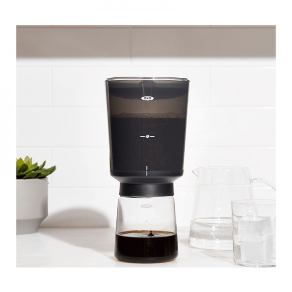 Love homemade cold brew but don’t have a lot of room? The OXO Brew Compact Cold Brew Coffee Maker is your small space solution. Create up to a week’s worth of smooth coffee concentrate in the 24-ounce brewing container. It’s easy to use, add ground beans and pour water into the perforated rainmaker™ top to evenly distribute water over the grounds. Brew 12 – 24 hours on your counter or fridge, then place the brewer onto the borosilicate glass carafe to drain. The ultra-fine, reusable stainless steel mesh filter prevents grounds from escaping into your brew. The carafe’s cork stopper has a silicone seal that helps keep the concentrate fresh. When you’re done, the brewer and carafe nest for neat storage. Handwash all components.