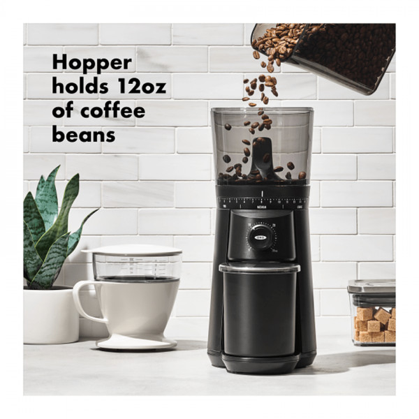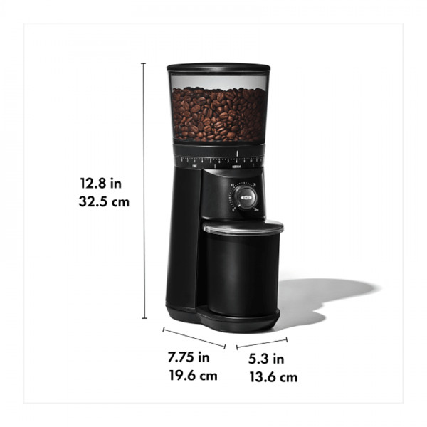 The OXO Conical Burr Coffee Grinder helps your beans unlock their full potential, because the best coffee starts from the grounds up. The design is simple, so nothing stands between you and your first cup. Just add beans and choose from 15 grind size settings – from fine for espresso to coarse for French press – turn the dial to select grinding time, and push to start. Stainless steel conical burrs create uniform grounds, for golden cup standard flavor, and the one-touch timer keeps your last setting, so you don’t have to reset it every time. It has a powerful DC motor that works to preserve the flavor of your beans and won’t overheat them. The matte black finish adds an elevated texture and finish to your kitchen or at-home coffee bar. Non-decorated components are dishwasher safe.
