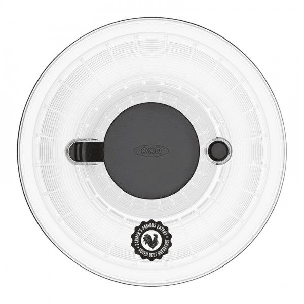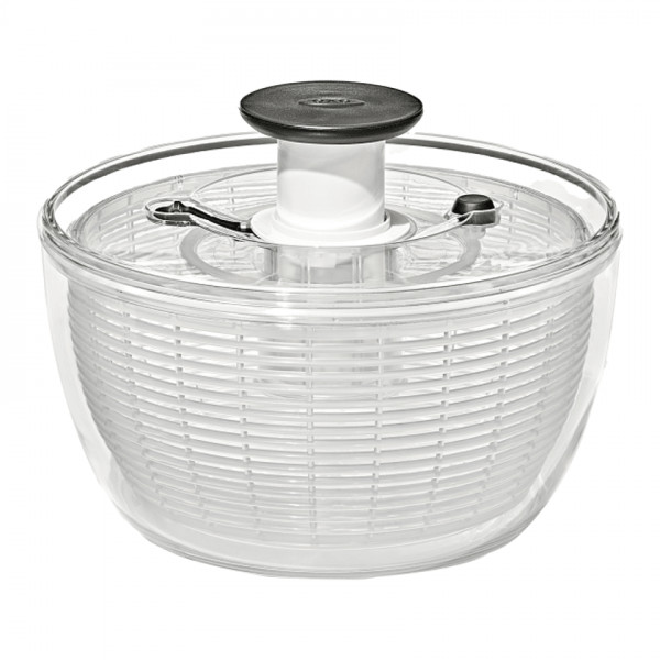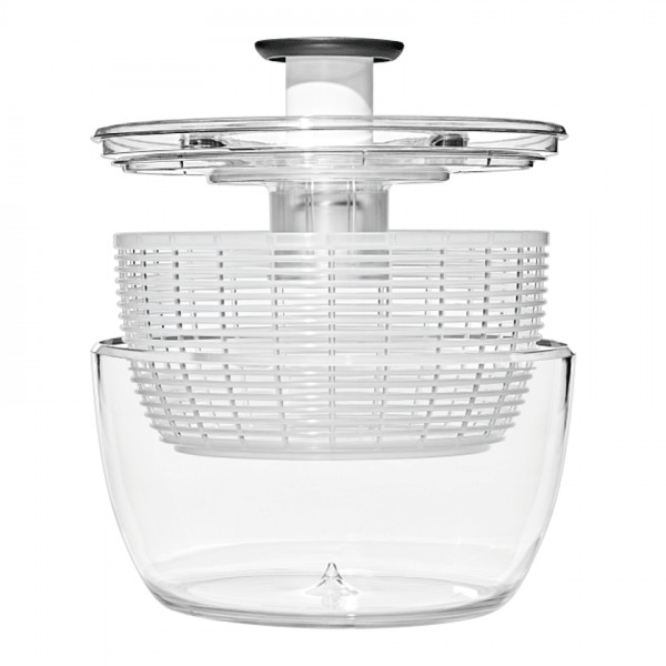 The OXO Good Grips Salad Spinner is the quick and easy way to dry greens or herbs. For clean, dry ingredients, just press the soft, non-slip knob. The spinning basket doubles as a colander, so you can rinse lettuce and more with ease. The non-slip base prevents skidding, and the patented built-in brake button stops the Spinner on a dime for unloading. Toss and serve your salad right in the bowl: The durable dish is crystal clear and moves seamlessly to the table. Simply slide the lock to hold the pump flush with the lid for compact storage. The lid comes apart for thorough cleaning. Bowl capacity is 6.22 qt/5.89 L; basket capacity is 4.95 qt/4.68 L. Non-decorated components are dishwasher safe.