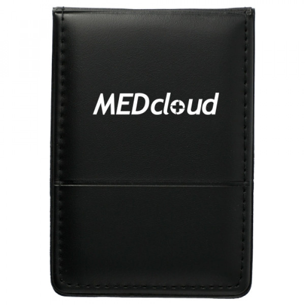 The 3.5" x 5" Pal Pocket Jotter includes a refillable 30 ruled page notepad interior business card slots and a pen loop. Notepad size: 3" x 4".