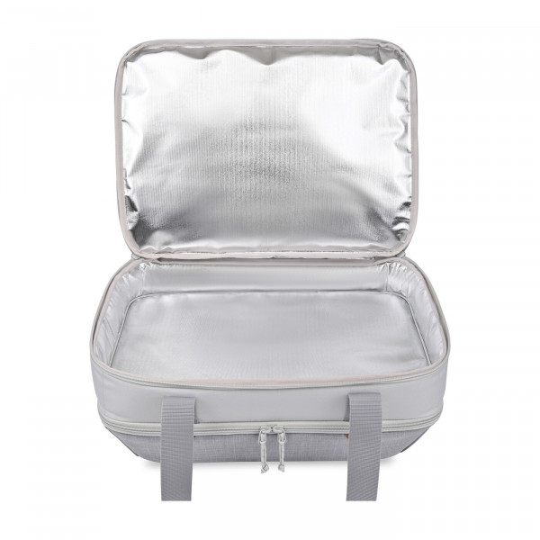 - Dual insulated foil-lined compartments keep food hot or cold