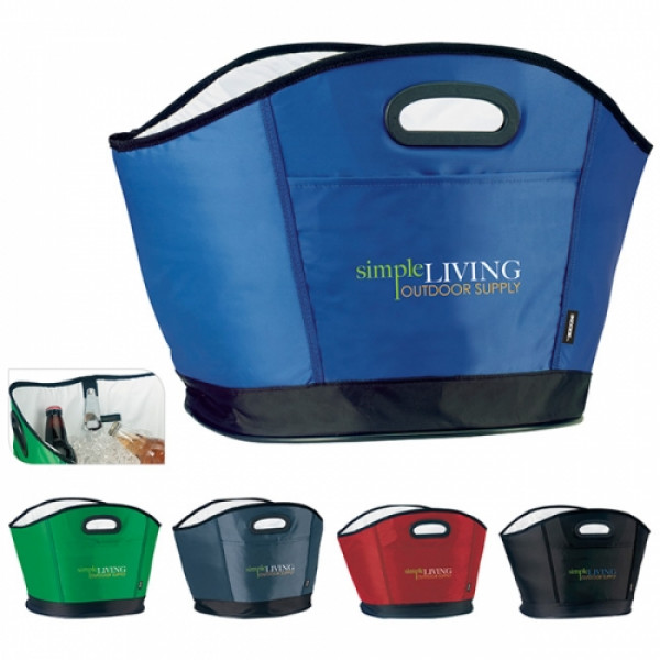 The Koozie® Party Cooler holds up to a case of 12-oz. cans plus ice and features a bottle or can opener for easy use! Cooler also contains a easy clean leak proof vinyl liner and open flat front pocket.::Holds 12 cans plus ice::Features bottle/can opener::Easy to clean, leak-proof vinyl liner