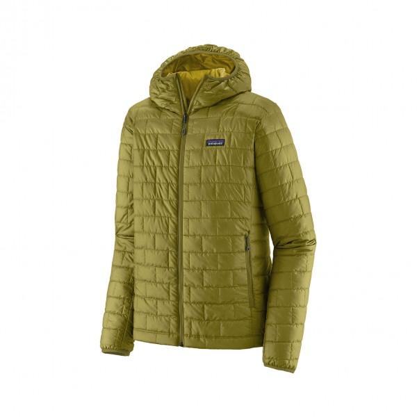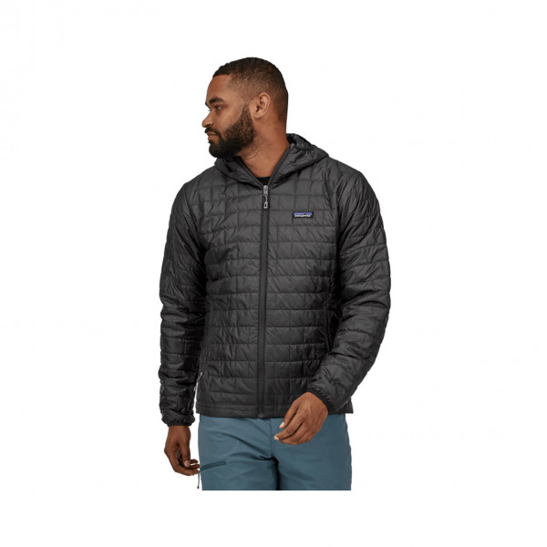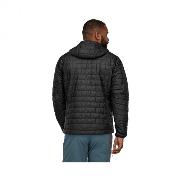 The Men's Nano Puff® Hoody is a lightweight, packable jacket engineered for warmth, windproofing, and water resistance. Its 60-g PrimaLoft® Gold Insulation Eco, made from 100% postconsumer recycled polyester, provides exceptional warmth even when wet, while the 100% recycled polyester ripstop shell with a PFC-free DWR finish offers durability and moisture protection. Designed with a brick quilting pattern for insulation stability and abrasion resistance, this hoody features a simple under-the-helmet hood, zippered handwarmer pockets, and an internal chest pocket that doubles as a stuffsack. A drawcord-adjustable drop-tail hem helps seal in warmth, making it an ideal choice for various outdoor activities.