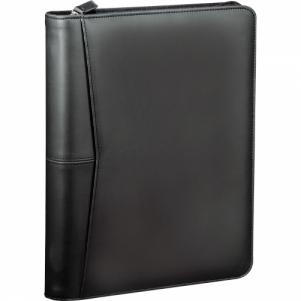 ::Zippered closure. ::Interior organizational panel features pen loop, USB memory pocket, gusseted multi-functional pocket, five business card pockets and a mesh ID window. ::File pocket. ::Features 1" metal three-ring binder. ::Includes 8.5" x 11" writing pad. ::Pen not included.