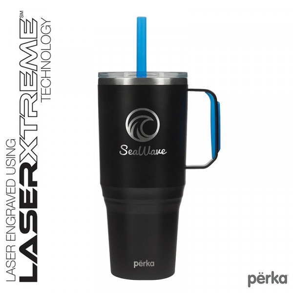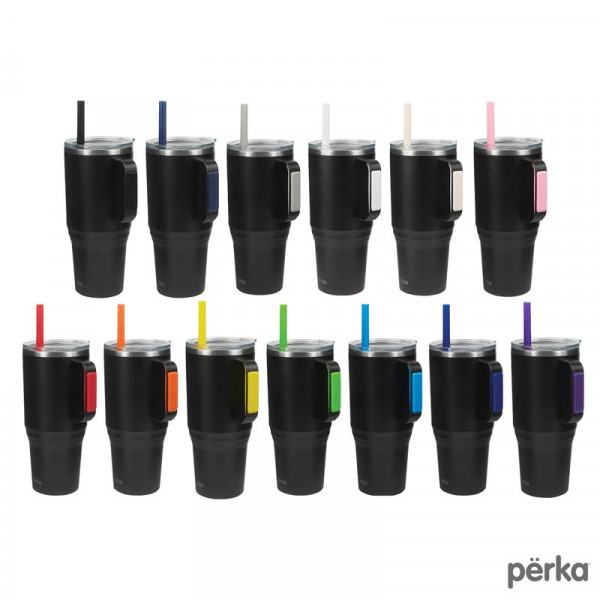 The Perka® Portofino 36 oz. Travel Mug combines eco-friendly innovation with everyday functionality for those who value both sustainability and style. Crafted with 90% post-consumer recycled stainless steel, this vacuum-insulated mug keeps beverages hot for up to 12 hours or cold for up to 24 hours. Its ergonomic handle with a soft silicone grip and removable color-matching straw offer comfort and convenience wherever your day takes you. A thoughtful promotional product, it can be custom branded to align your message with purpose—supporting both the planet and a meaningful cause.