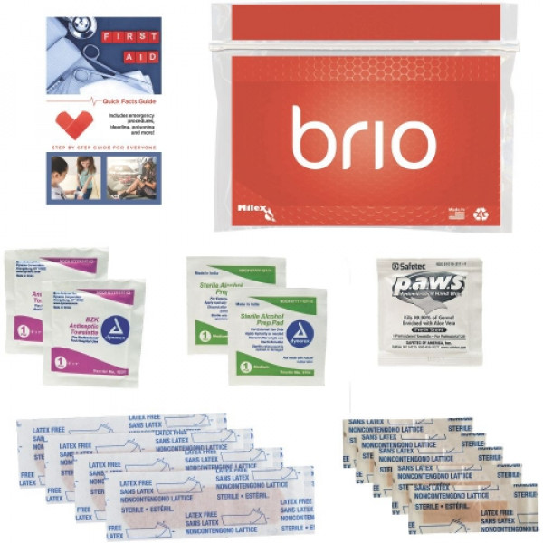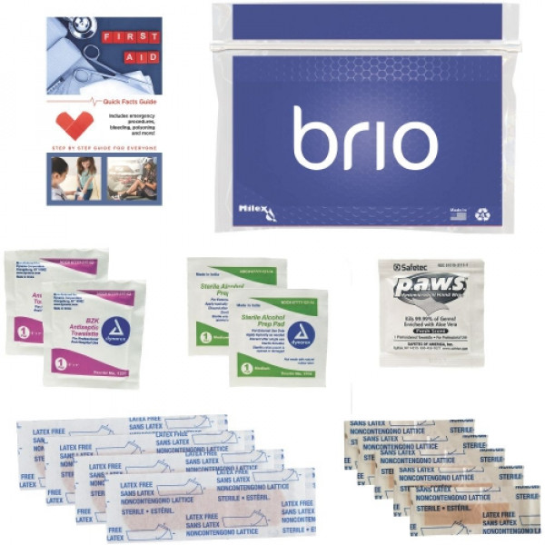::This compact first aid kit will fit just about anywhere::Kit includes: First Aid Quick Facts Guide, 2 Antiseptic Towelettes, 2 Sterile Alcohol Prep Pads, 1 Antimicrobial Hand Wipe, 4 Flex-Fit Bandages 3/4" x 3", and 5 Junior Bandages 3/8" x 1.5"::Our Mylex waterproof first aid kit is resealable and contains the essentials youll need to treat the basics'::Features a tear away seal making sure that the contents remain intact::Entire assembled package is water-resistant