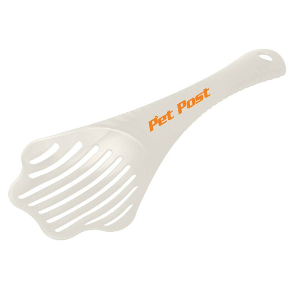 Paw shaped scoop for cleaning cat box. Sturdy construction with long handle. Ideal for pet stores, veterinarians and cat shows.::Made in the USA.