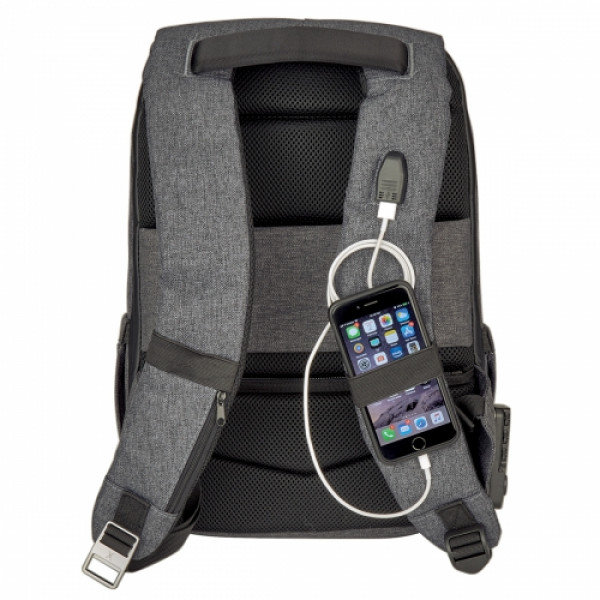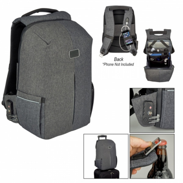 Travel everywhere with our Essential Phantom Backpack! Its reflective accents ensure visibility, while the adjustable padded shoulder straps offer maximum comfort. With features like a bottle opener, zippered pockets, carrying handle, and storage loops, convenience is at your fingertips. The double zippered main compartment provides ample space for all your essentials, and the air mesh padded back keeps you cool on the go. Plus, the inside padded laptop compartment and multiple pockets keep your gadgets secure. It can even accommodate most tablets and laptops up to 15"! Charge up using the 37" USB cord and the outside charging port for easy access. The TSA combination lock keeps your belongings safe while the trolley sleeve allows for easy transport. So, whether you're tackling the trails or conquering the concrete jungle, our Phantom Backpack is the perfect sidekick.