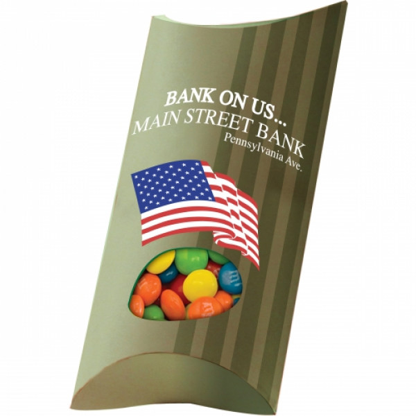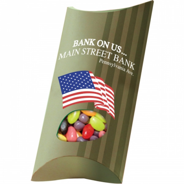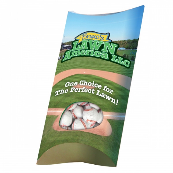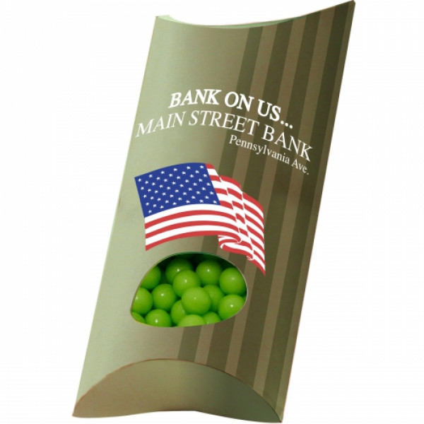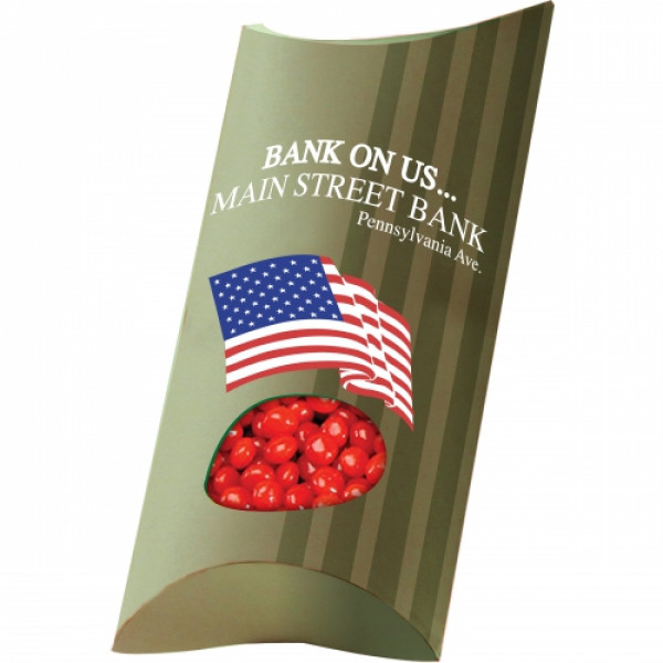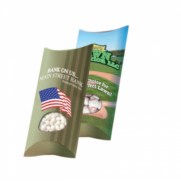 ::Our Zagaboxes can be custom packaged to promote your business needs.::Time to think inside the box! Other fills include signature peppermints, jelly beans, red hots, colored candy, candy coated chocolate, and chocolate balls.::Custom pillow box circle with custom packaging, four color printing, and laminate on printed side.