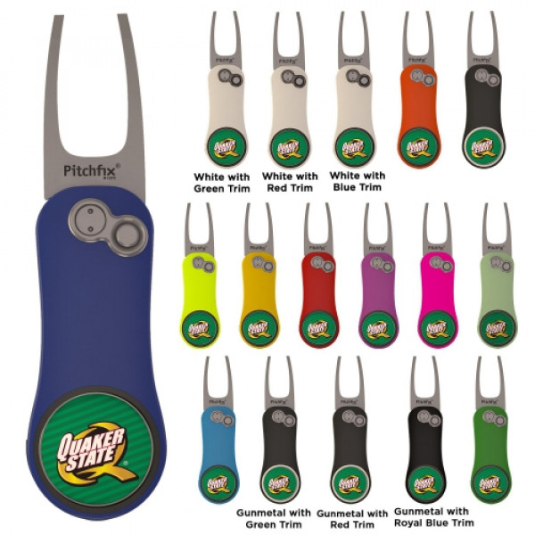 ::Includes integrated pencil sharpener<br />::It comes with a personalized removable ball marker with your company or events logo<br />::Custom magnetized ballmarker with full color imprint<br />::Durable polyurethane dome keeps logo protected<br />::The Hybrid 2.0 is a lightweight switchblade divot tool made from 2 aluminum sheets with great feeling ABS rubberized handles