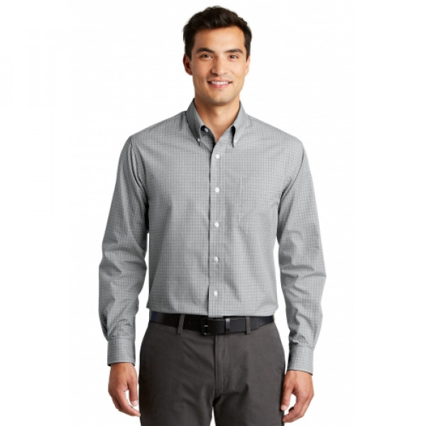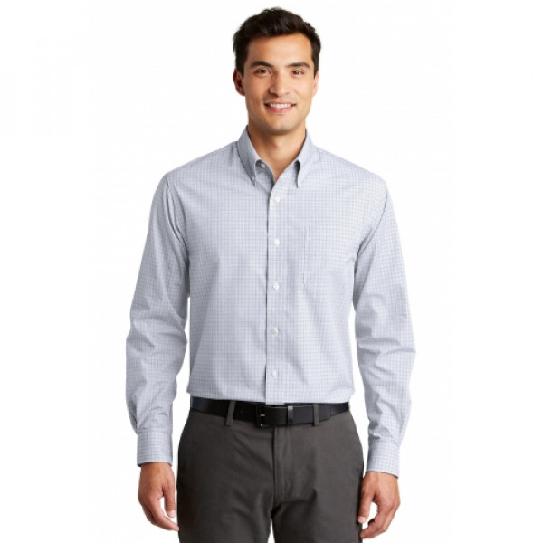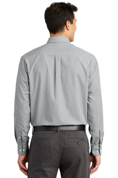 A not-too-bold plaid pattern offers a welcome break from a solid color. Designed for comfort and wrinkle-resistant convenience this yarn-dyed poplin shirt is ideal for both dress and casual wear. ::3.21-ounce, 55/45 cotton/poly ::Button-down collar, Pearlized buttons and Patch pocket ::Box back pleat, Button-through sleeve plackets and Adjustable cuffs