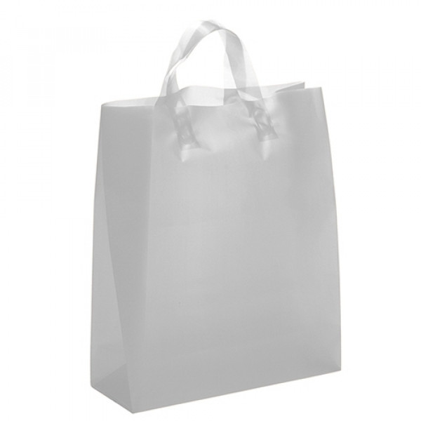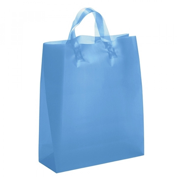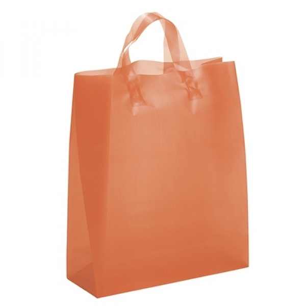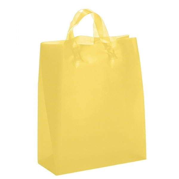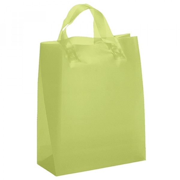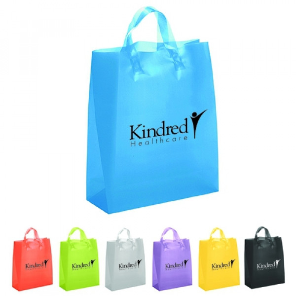 Hi-density 13" frosted bright color plastic ink imprint shopping bag with matching fused loop handles, side and bottom gussets and cardboard bottom insert. 3.0 mil thick.::One color imprint recommended. Please call for information on multiple color imprint options.