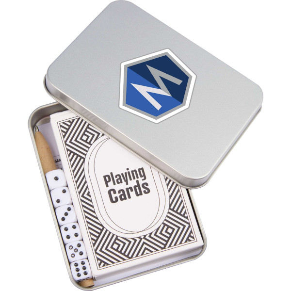 The Playing Cards & Dice Game Set is an all-in-one set that provides unlimited hours of entertainment and fun! The set includes 54-piece standard index playing cards, 6-piece mini dice set, kraft paper pen and game scoring pad. All of which fit perfectly in the silver tin making it a great travel game set.